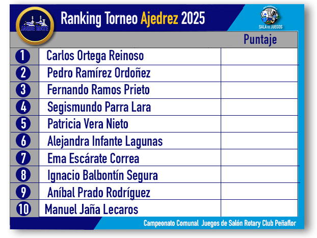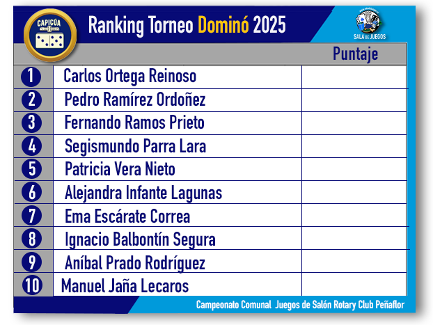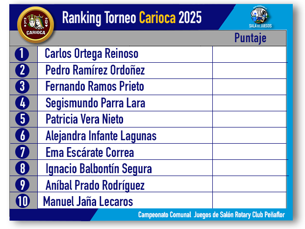 Aquí les presentamos el Ranking de Torneos de los 10 mejores en Juegos de Salón y Esparcimiento (haga click en Ver más sobre la imagen en referencia) Carioca, Dominó, Dudo (Cacho),Ajedrez.